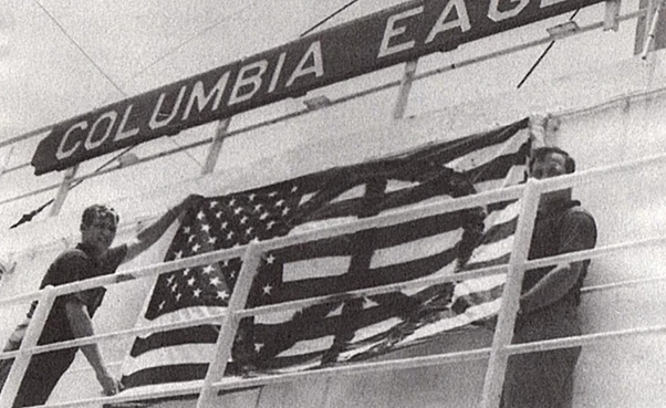 G: Not at that time, but later, Yeah. With the Columbia Eagle, the plan to divert or sink the ship was made before we ever left the United States. Both McKay and I had a strong political relationship regarding the political clarity on what was necessary to stop those weapons: Direct Action.The ship was carrying napalm to Thailand for use in the Vietnam war, in particular on Laos and Cambodia, both neutral countries, and along the Ho Chi Minh Trail. We couldn’t let that happen. We had the skills and the will —and we had the political clarity. It wasn’t just saving ourselves from the draft. It was about stopping the war machine.